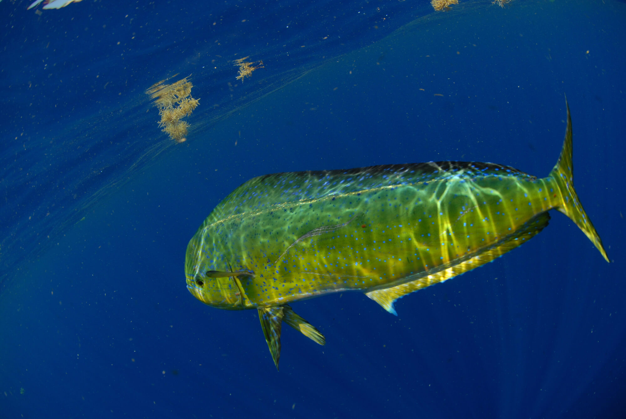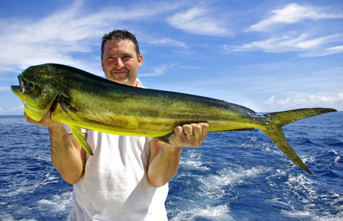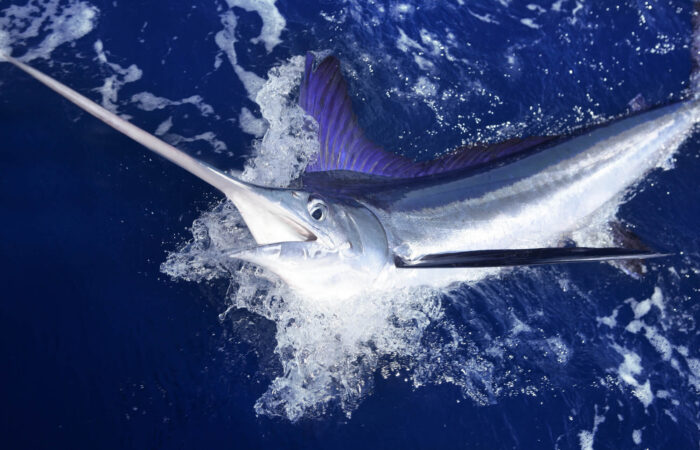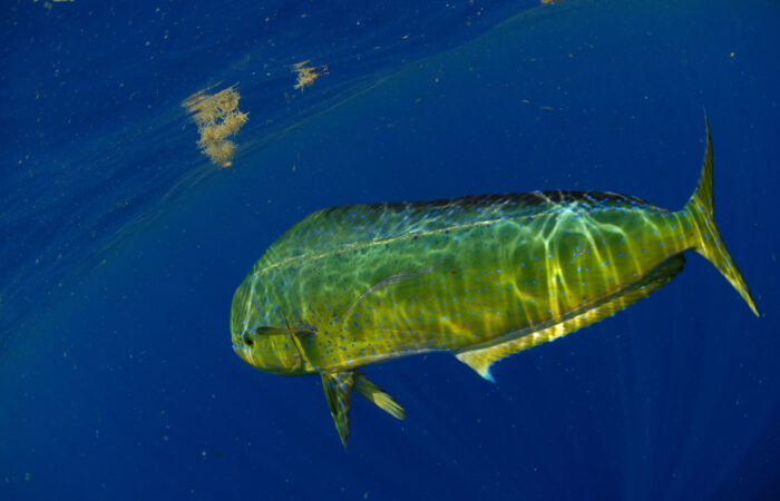 In summer we catch blue marlin, yellowfin, blackfin, bigeye, skipjack, albacore tuna, and mahi mahi. In winter we catch BIG wahoo, white marlin, sailfish, blackfin, and bigeye tuna, plus barracuda. We have 7,000-foot depths just 20 minutes from the marina and so “lines in” within 30 minutes.